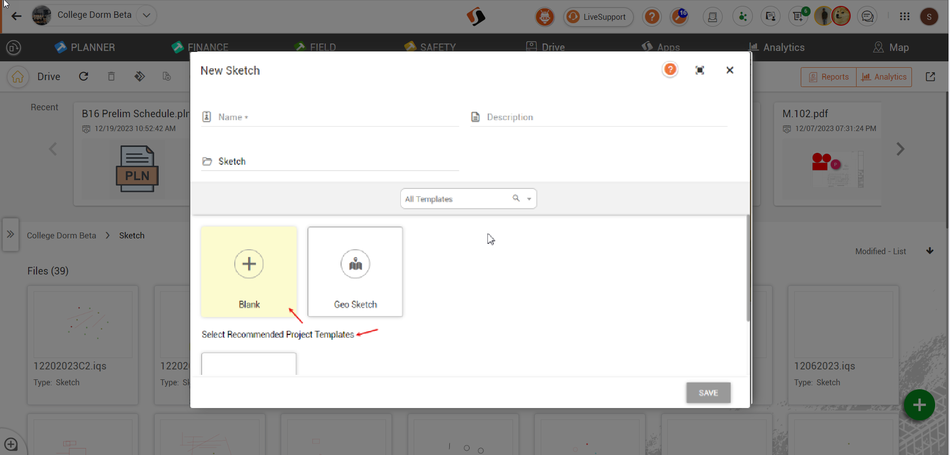 • The New Sketch will allow the creation of a new sketch by clicking on the blank icon or by using an existing template list as shown below.